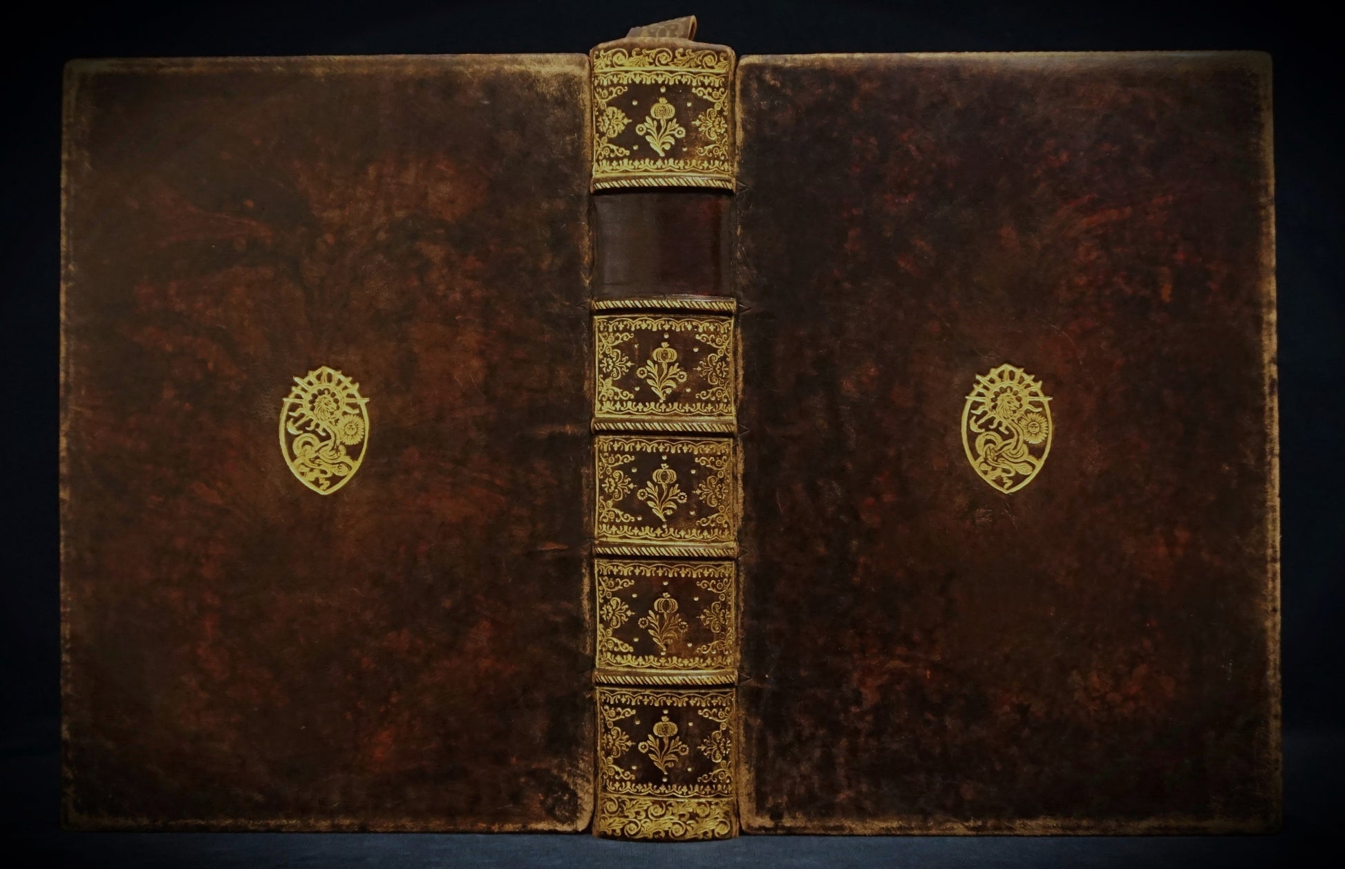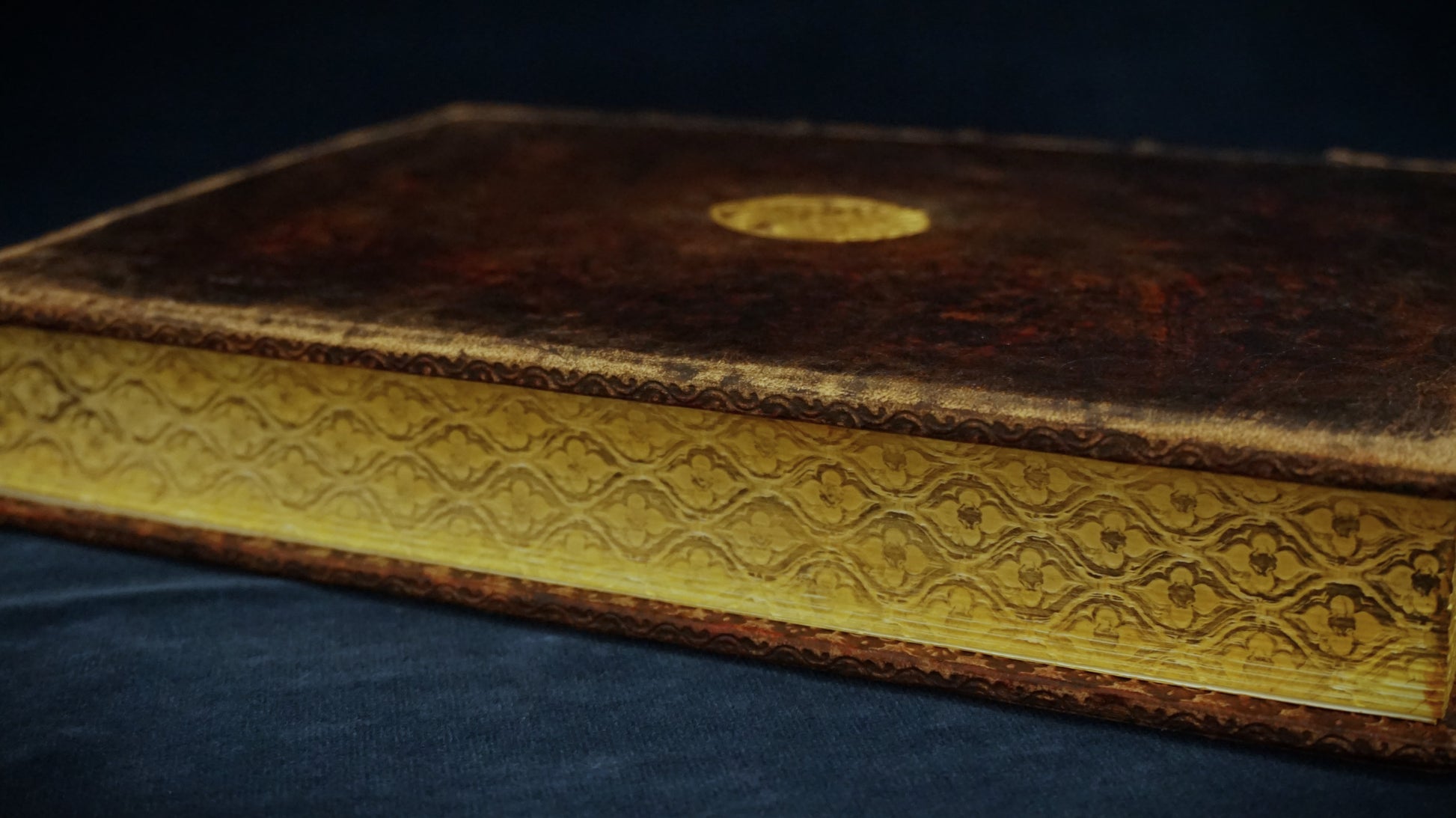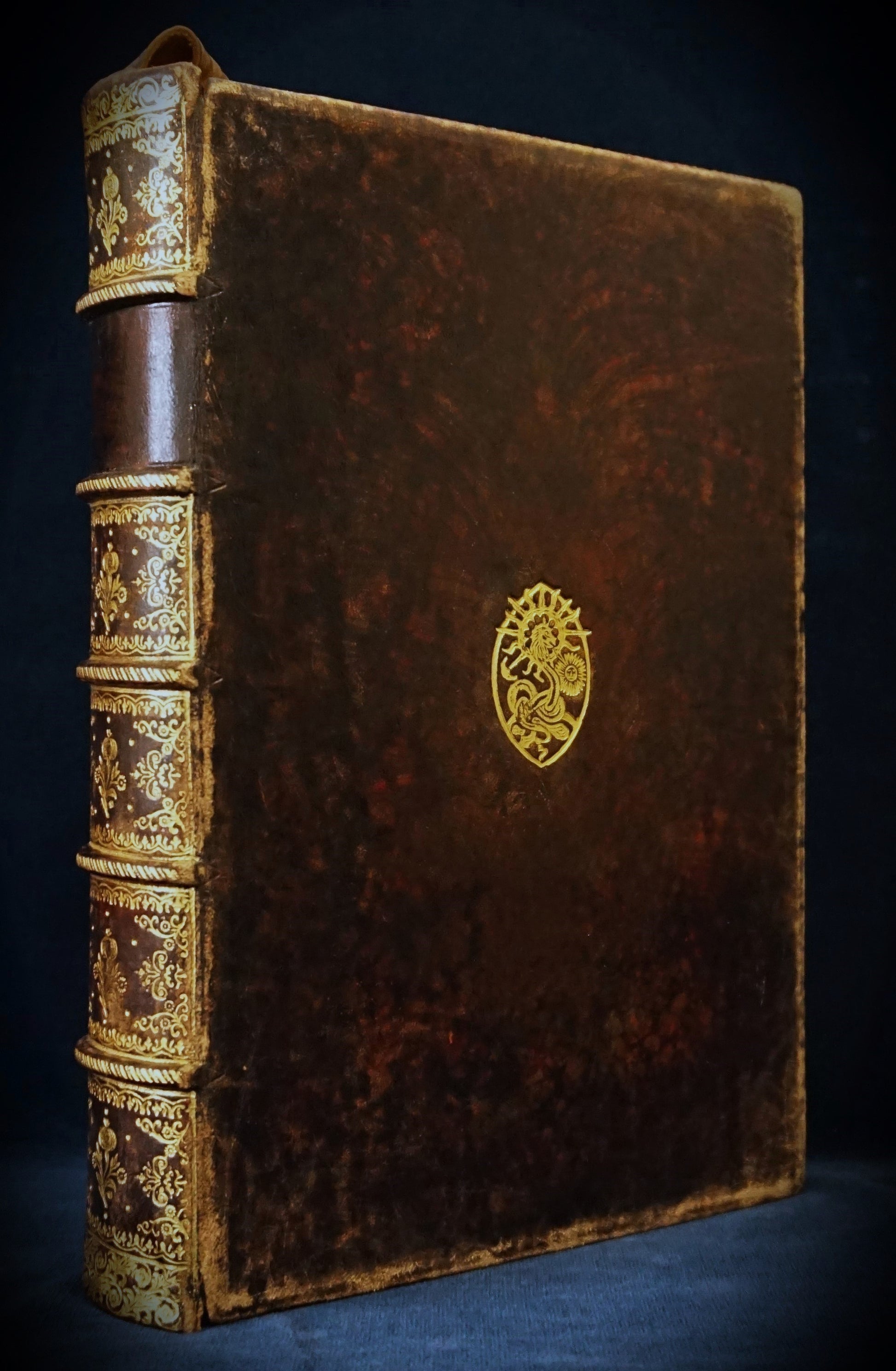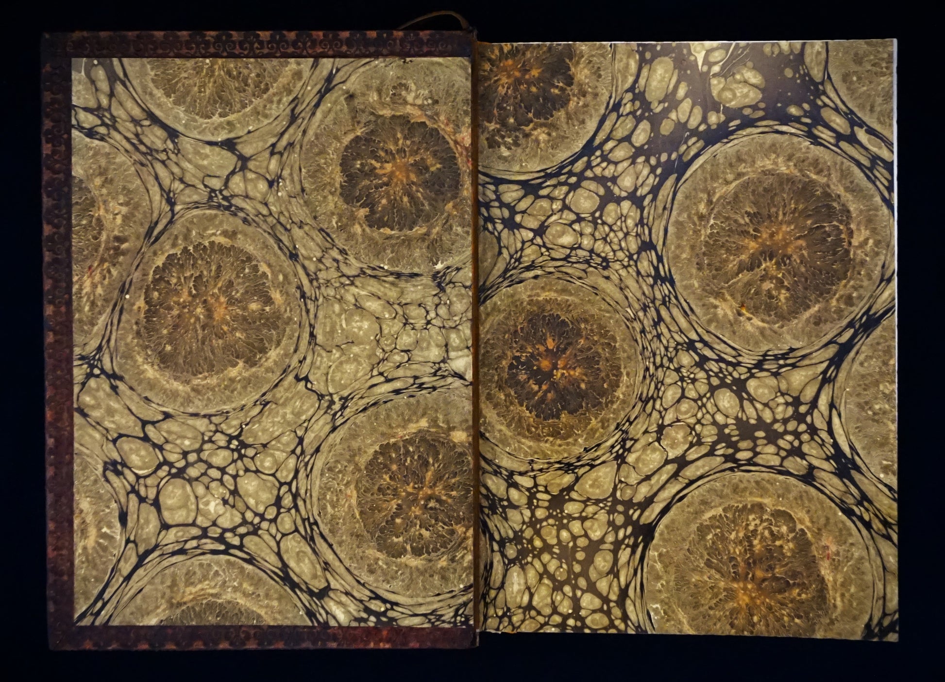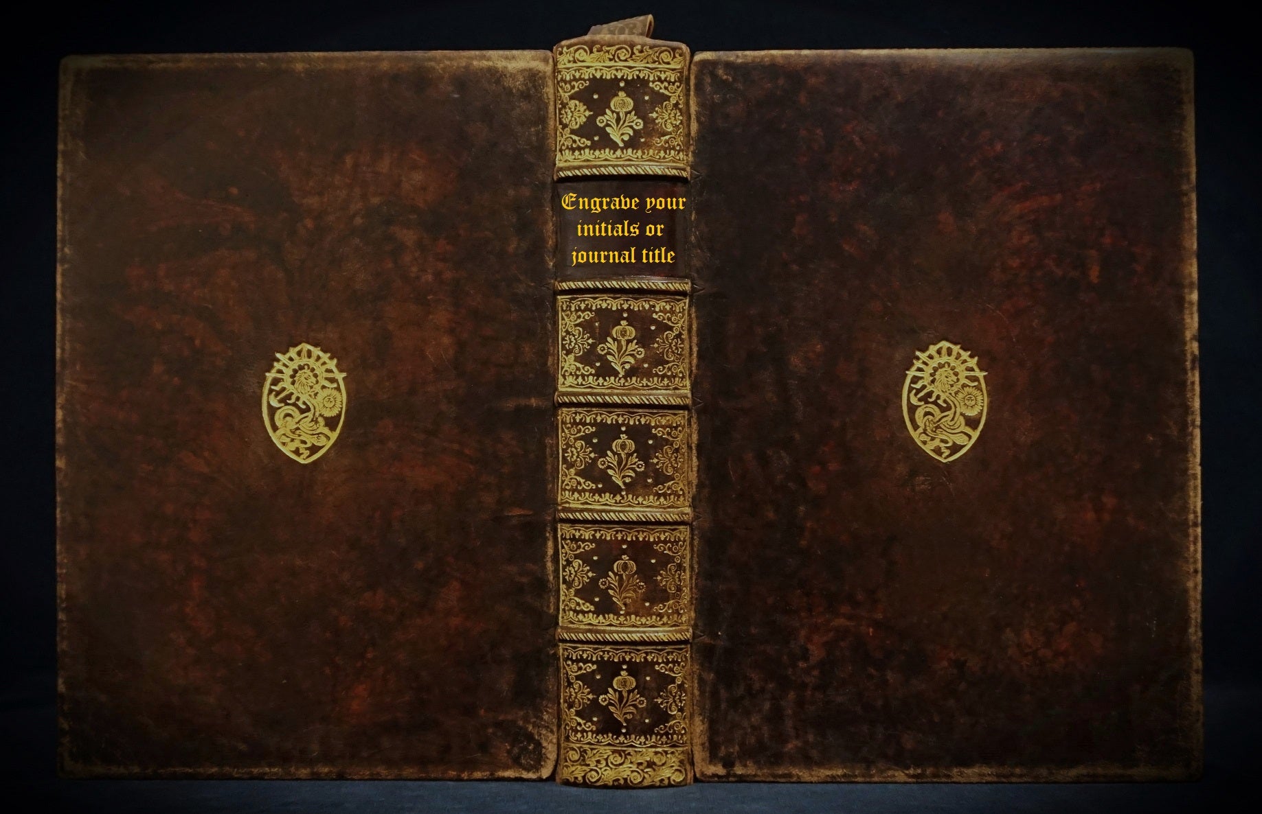 This journal is bound with aged looking brownish leather. On the center plate, I did 24K gold leaves tooling the Chnoubis symbol. On the spine I also did 24K gold leaves tooling to follow 1700 Naple's binding style. The edges are decorated.