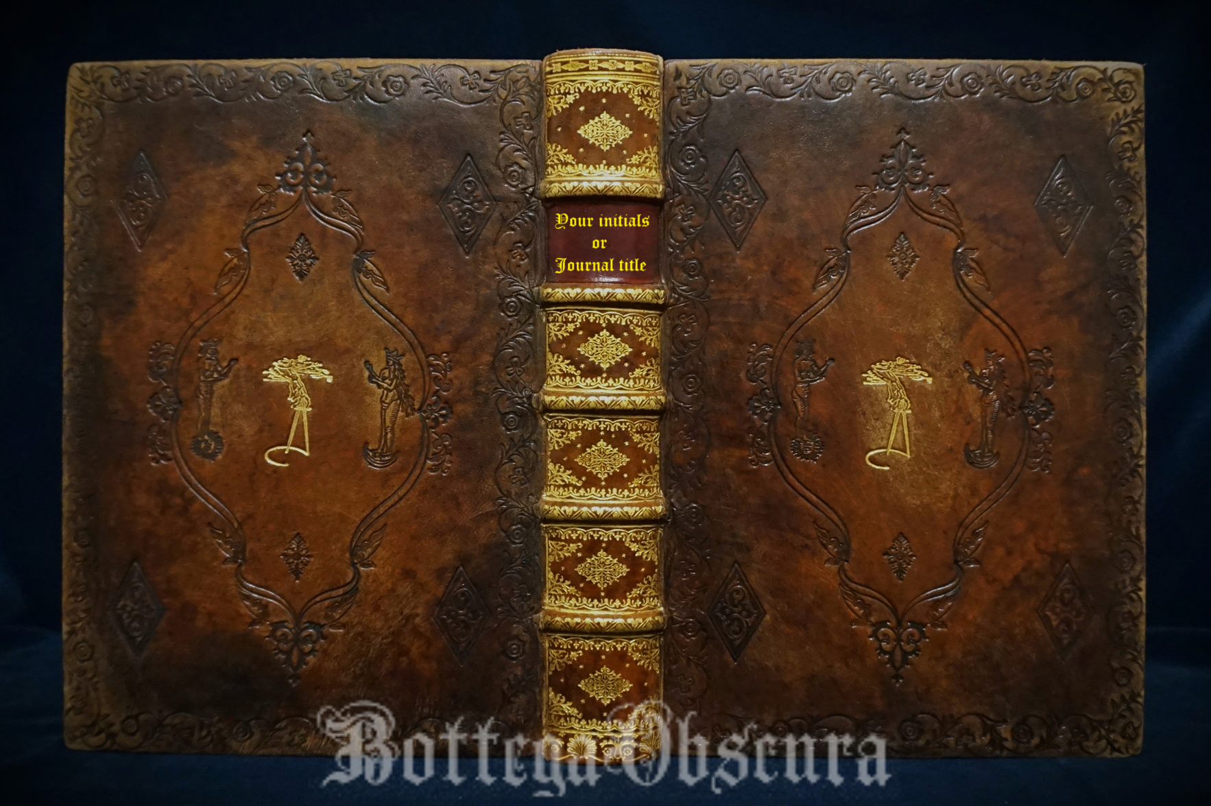 I bound this journal with hand dyed brownish Italian leather which I got inspiration from 1700 antique Naple style binding. The symbols engraved on the center plates are 'Great Architect' which signifies a concept of a supreme deity who designed and created the universe with purpose and wisdom.