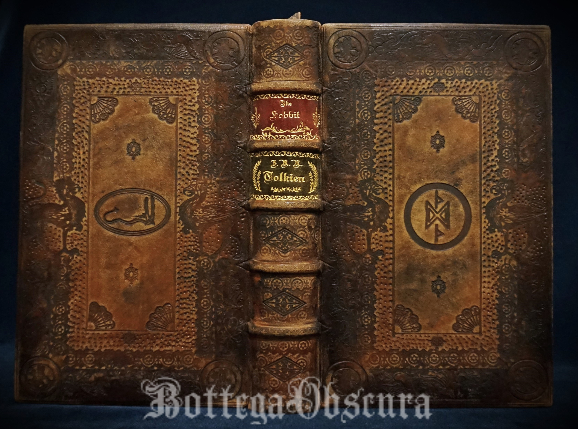 Hand sewn and hand bound 'The Hobbit'. I bound my book with high quality hand dyed Italian leather. The book is sturdy to hand down to the next generations because the pages were hand sewn. I did blind tooling decorations onto the book plates and spine. Title and author were gilded with 24K gold. I also added tooled leather bookmark for the overall harmony. As an endpaper I used handmade marbled paper which I made and selected the best one for the book. The book edges are marbled too.